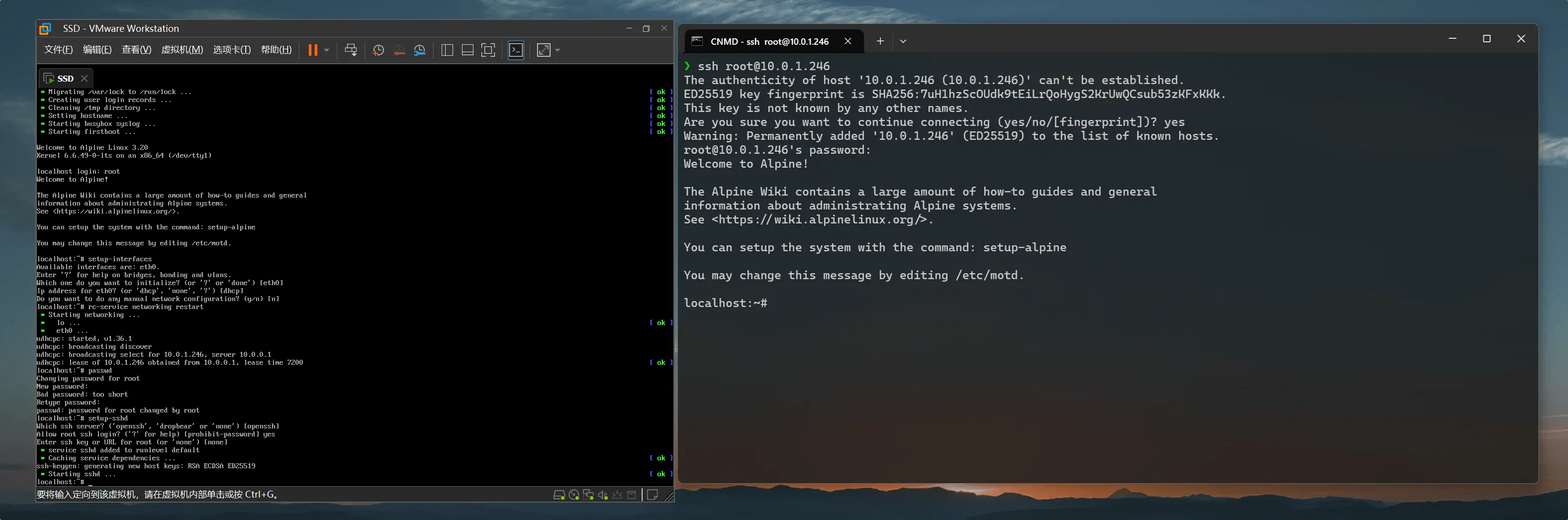 1 | # 设置密码 passwd # 使用内置脚本配置ssh服务,务必允许 root 登录 setup-sshd # 查看本机IP ip a |