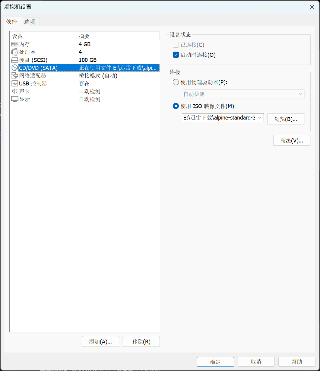 此处使用虚拟机演示,直接将 CD/DVD 指定到 ISO 镜像,如果是实机环境可以采取写盘或者 Ventoy