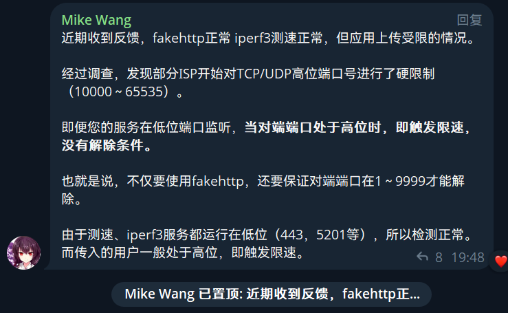 另外发现如果这个 iperf3 加个 -t 0 参数一直跑着,即使给 FakeHTTP 停了,也不影响测速。反之,如果先测速,然后再开 FakeHTTP,那么测速就是 5M。说明只需要在连接建立的时候发那个 HTTP 欺骗即可,有点像 STUN + NAT1 的思路。然后发现这个作者就是打洞软件 Natter 的开发者,果然用二次元头像的都是大佬
