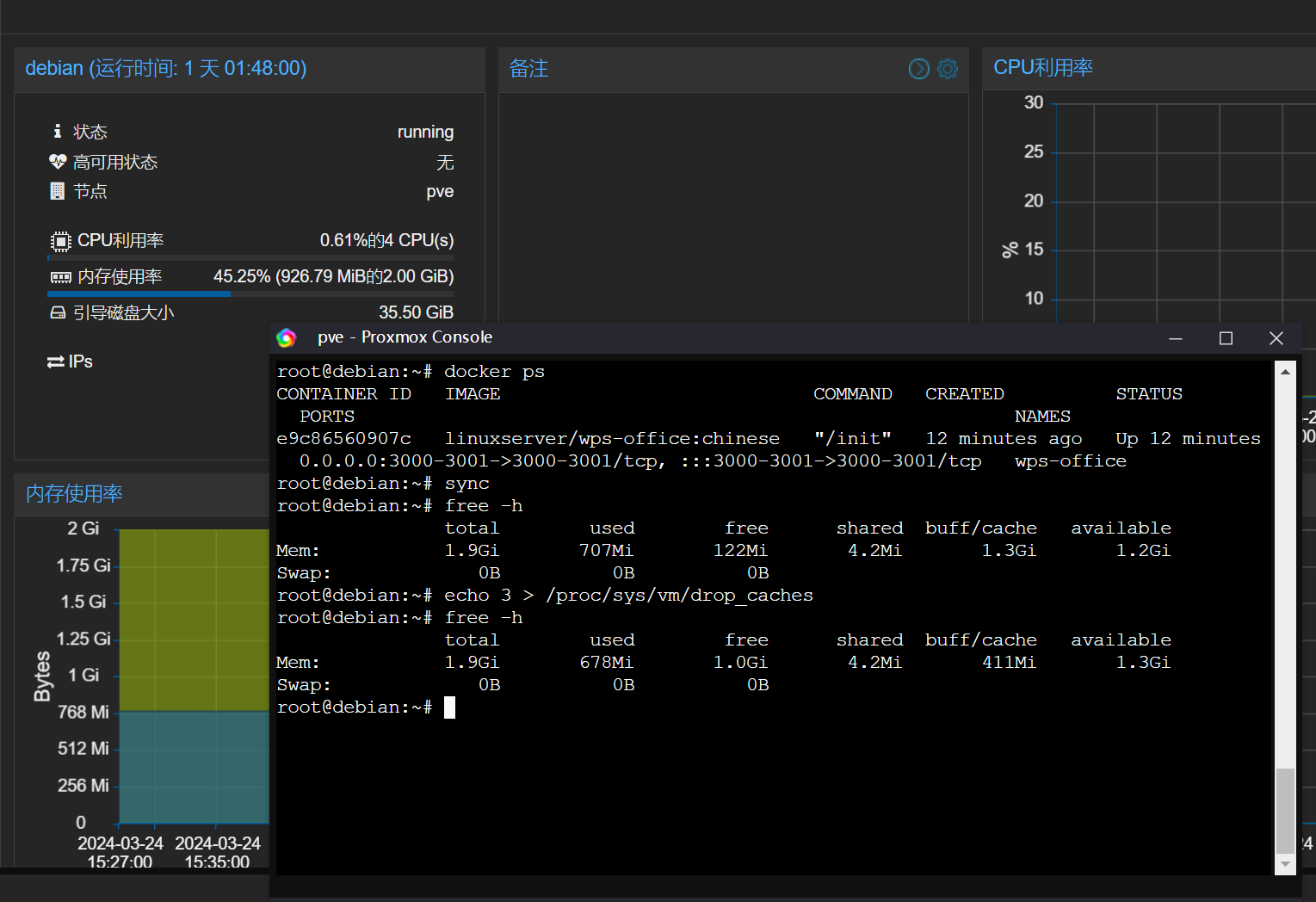 此时就会将这些缓存从内存中清理出去,到 PVE 宿主机上就可以看到内存占用大幅降低