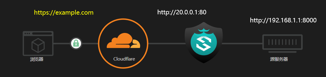 这里假设源站为http://192.168.1.1:8000 ,雷池 WAF 为http://20.0.0.1:80 ,CDN 访问为https://example.com