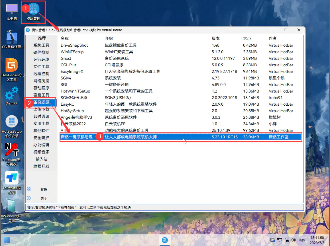您只需在 HotPE 或有 HPM 支持的PE下打开模块管理即可在线获取潇然一键装机助理。